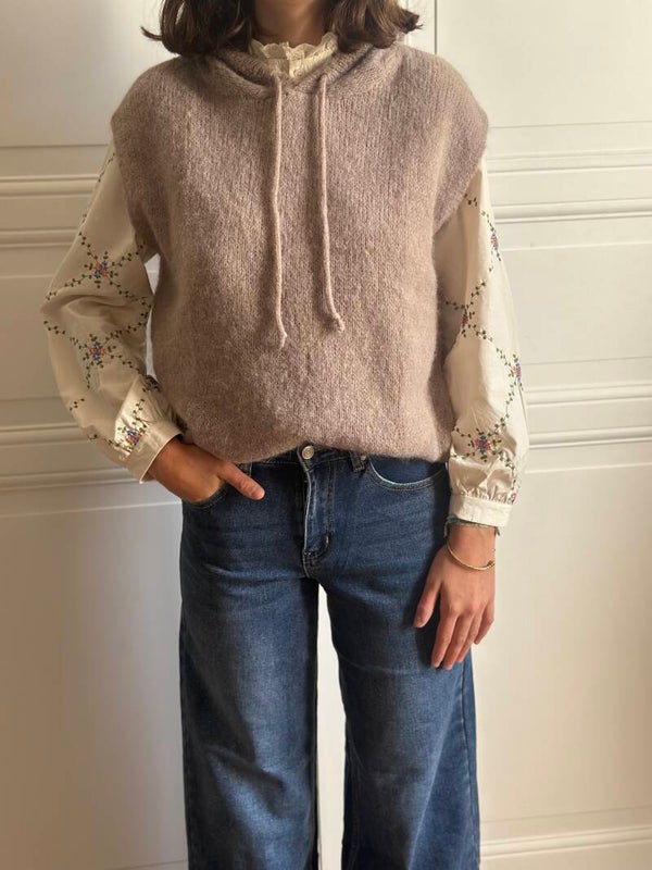 Dans cette tenue, le pull Joanna beige est associé à la blouse Lola et au jean Aria bleu