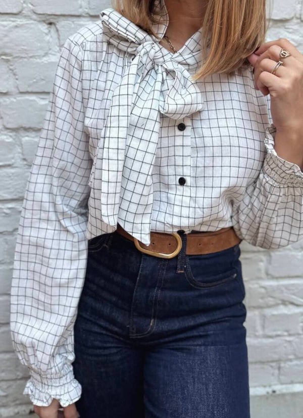 Chemise à carreaux noire et blanche avec un gros noeud à nouer au niveau du col